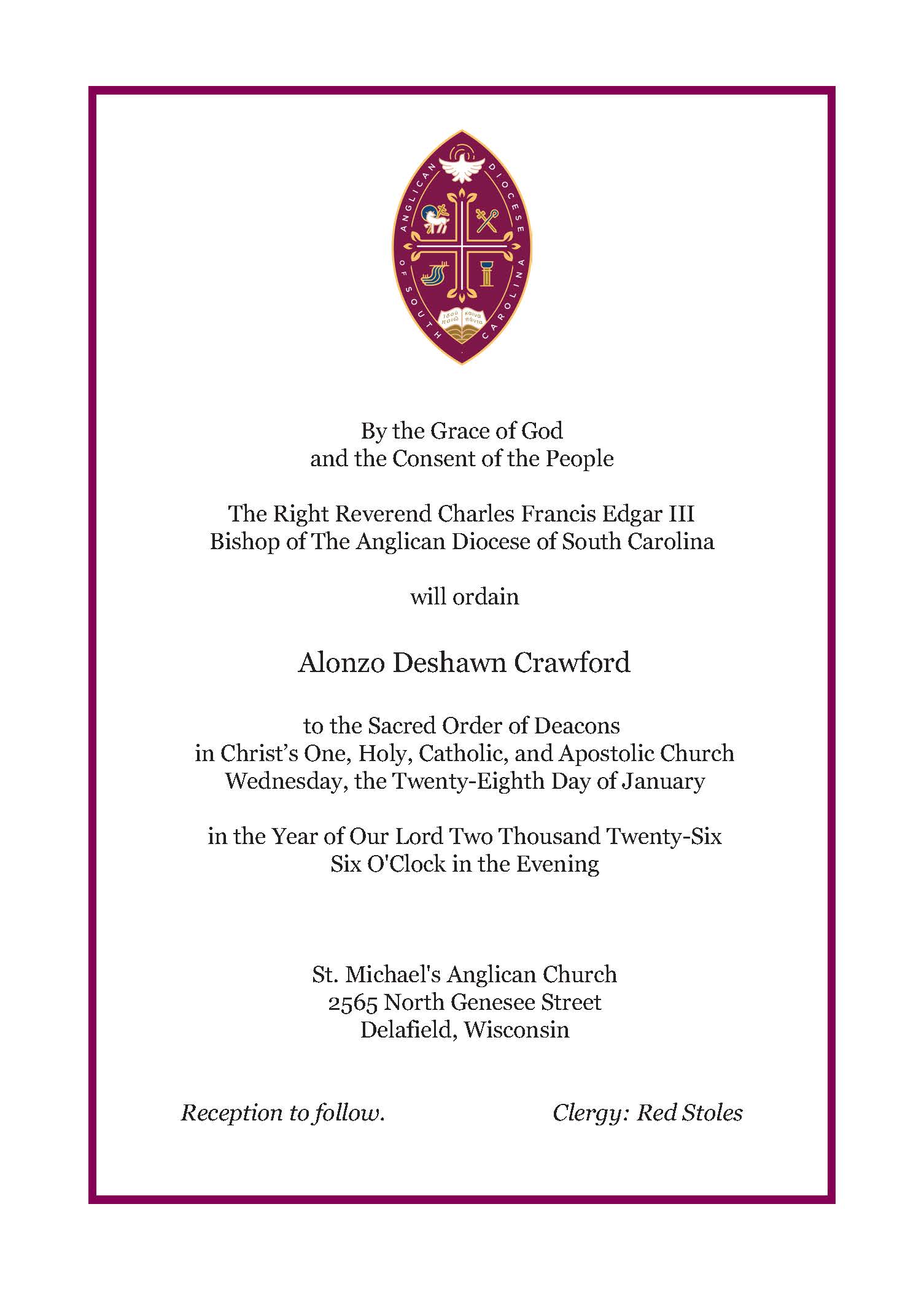 By the Grace of God and the Consent of the People, Bishop Chip Edgar, Bishop of the Anglican Diocese of South Carolina, will ordain Mr. Alonzo Crawford to the Sacred order of Deacons on Wednesday, January 28 at 6 p.m. at St. Michael’s Church in Delafield, Wisconsin.