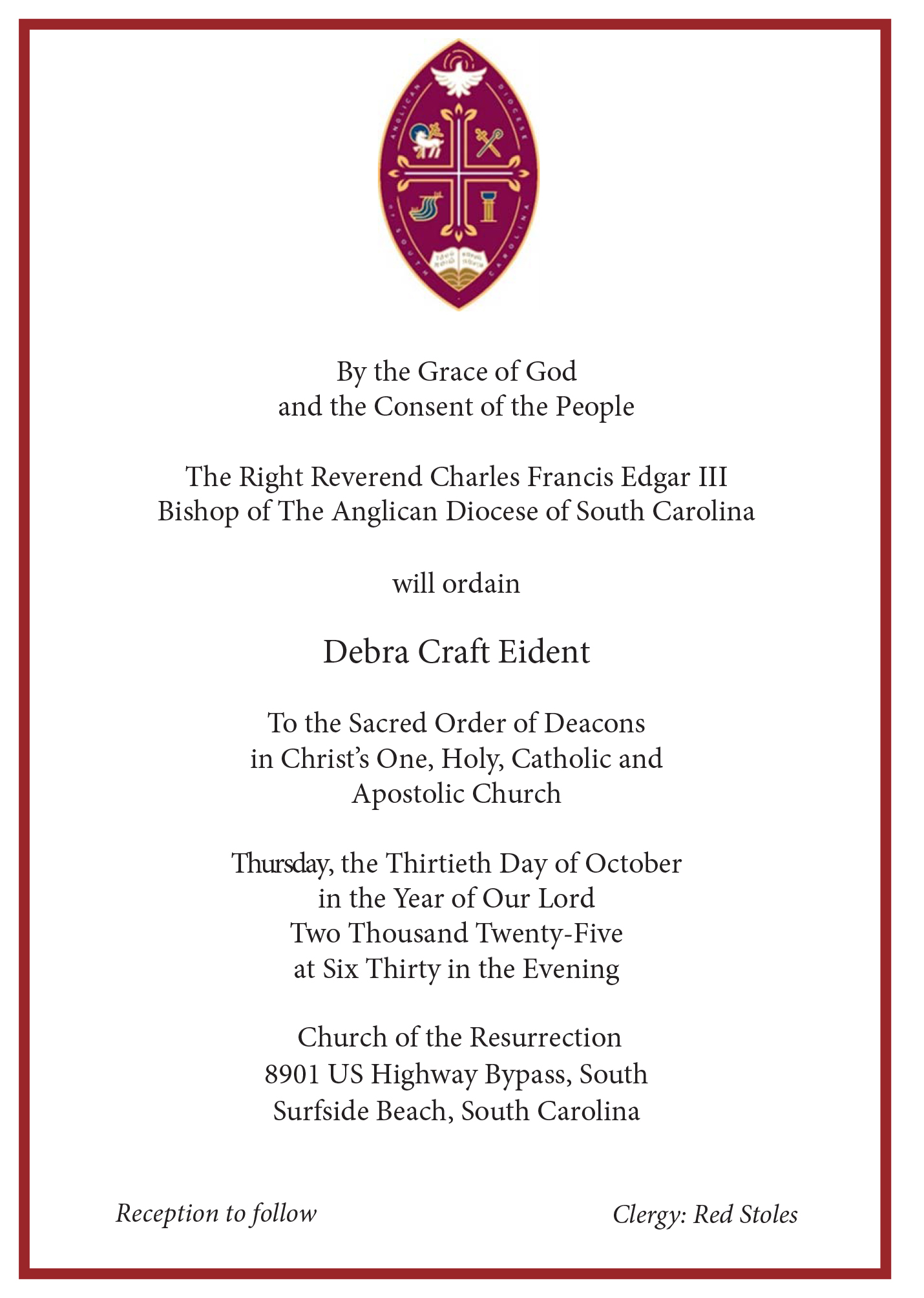 By the Grace of God and the Consent of the People, Bishop Chip Edgar, Bishop of the Anglican Diocese of South Carolina, will ordain Debra Eident to the Sacred Order of Deacons on Thursday, October 30, 2025 at 6:30 p.m. at the Church of the Resurrection, Surfside Beach, SC.
